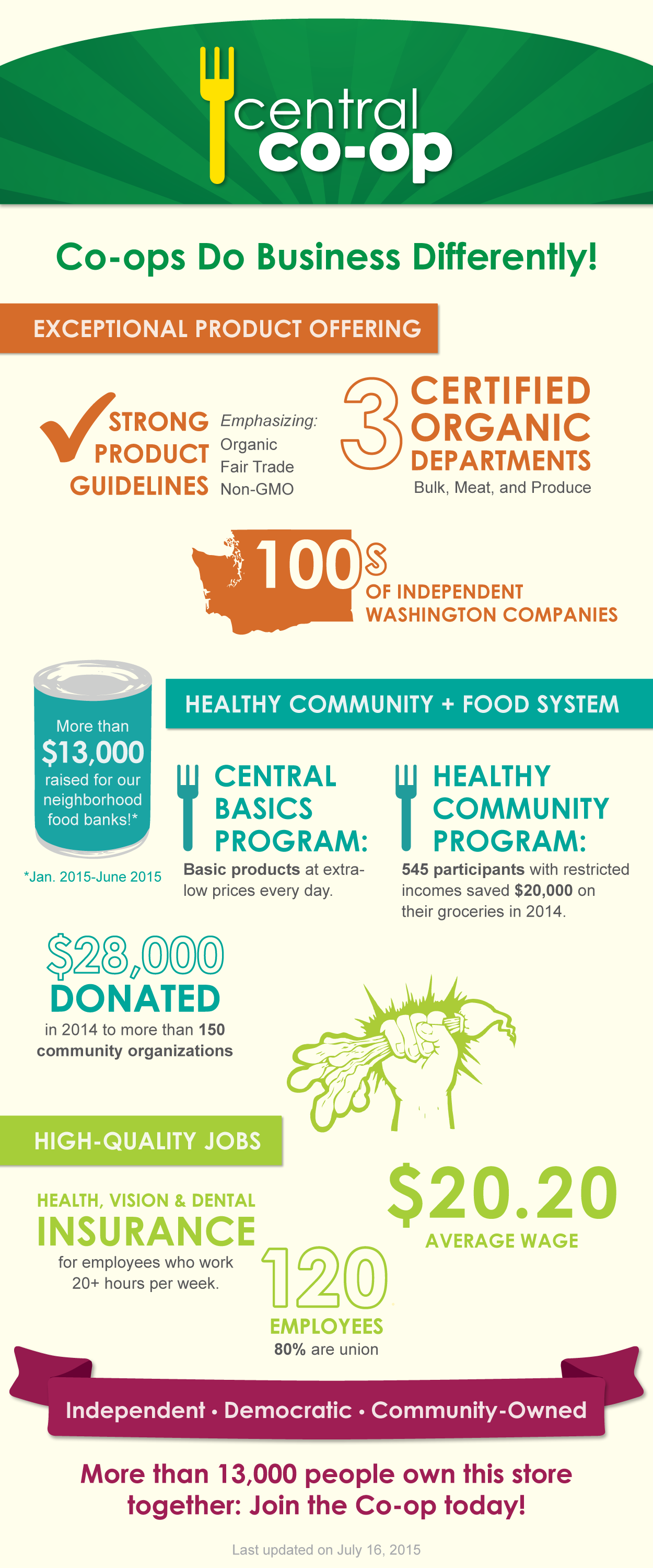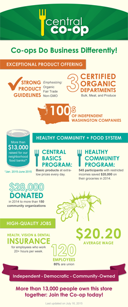 Central Co-op is a business, but we’re different. We’re independent, democratic, and community-owned, and we’re guided by the Seven Cooperative Principles. We’re here to serve our 13,000 owners, most of whom live in and around our neighborhood, not distant shareholders or a parent corporation.