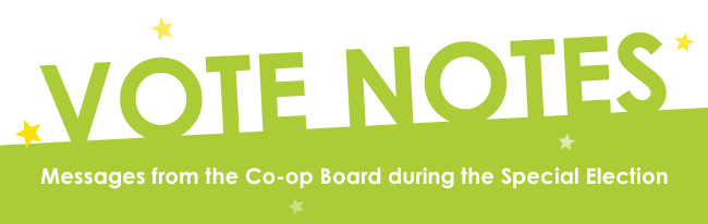 Our Special Election is in full swing and members of the Board have been engaging with members in the store and in a variety of meetings over the past several weeks. It's been a good experience and we've received a lot of great feedback. In these "Vote Notes" we will try to highlight some questions and comments that have arisen in the course of those discussions. Read on for our first official “Vote Note”.