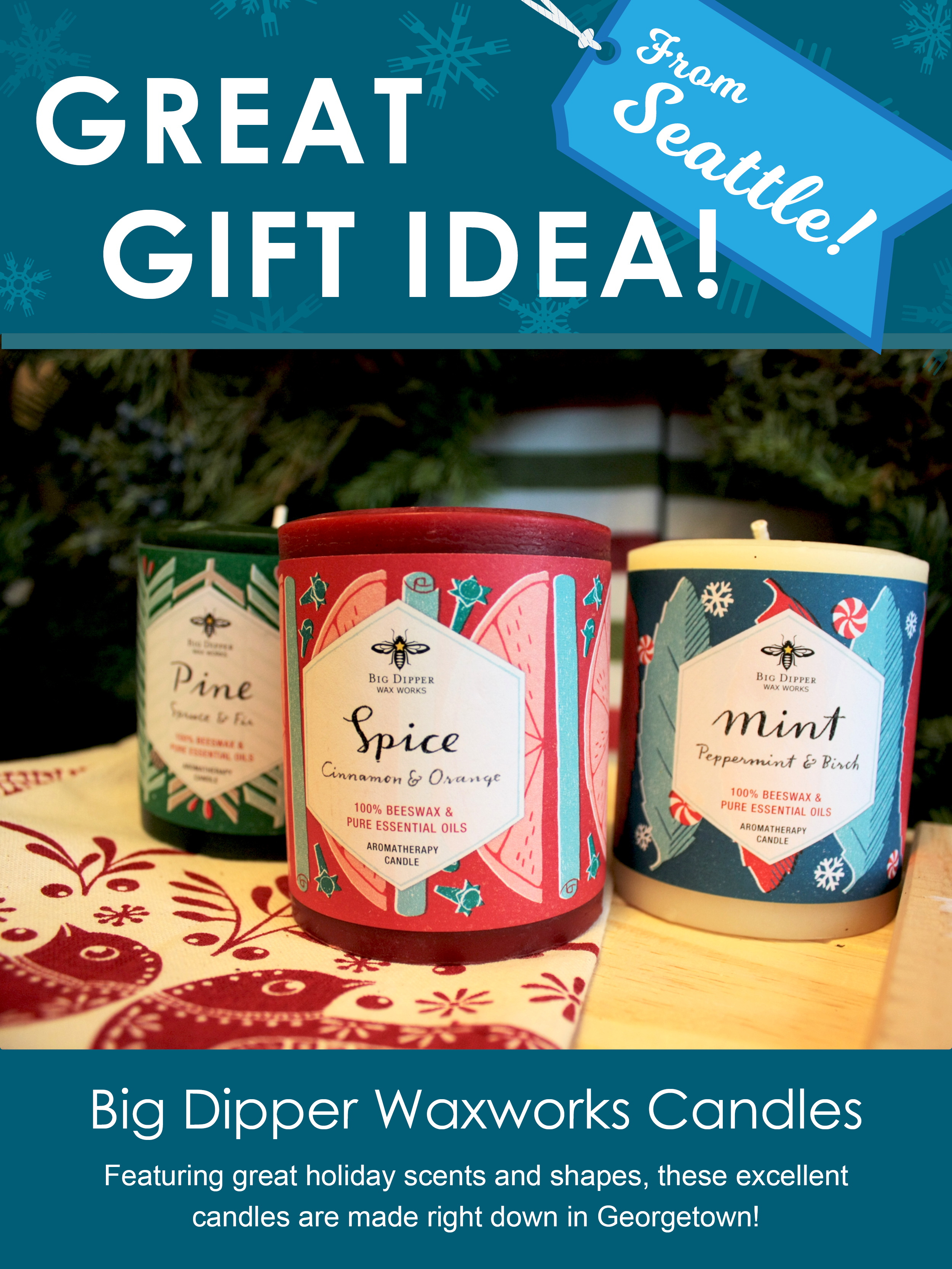While most candle wax is made from petroleum, Big Dipper Waxworks candles are hand-made from beeswax right here in the Georgetown neighborhood of Seattle. Give the gift of relaxation, beauty and soothing aromas, plus the peace of mind of knowing that you are supporting a healthier planet and local economy. |