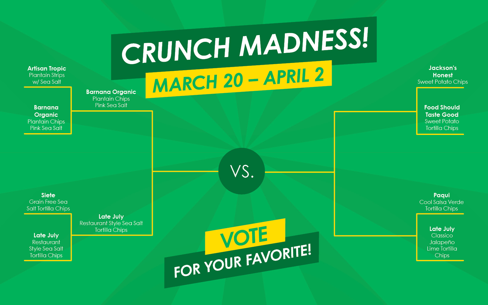 While the country obsesses about their college basketball brackets, we at Central Co-op are more excited about what we pop in our mouths while we watch basketball (or documentaries or rom coms or whatever you prefer): chips! That's why we've put together our second annual Crunch Madness bracket. Every two days we've set up a match-up of chip against chip, and we're inviting you to come in, have a taste, and vote for your favorite! The winner wins our coveted* trophy!**