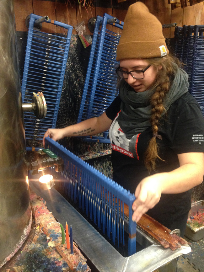 From the moment you step inside the door of the Big Dipper Wax Works factory, you’re enveloped in a warm, delicious cloud of honey aroma. The room is filled with vats of melted wax, cooling candles, and candlemakers busy at work tables. Most have a little tealight burning at their workstation.
