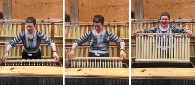 Flower started with an introduction to raw wax. “I like to call beeswax the Mercedes of candle waxes,” Flower told us, because it melts easily, burns longer than other waxes, emits negative ions, and is naturally aromatic. Other candle wax is often hydrogenated, hardened, bleached, and petroleum-based. Big Dipper uses pure beeswax in all of their products.