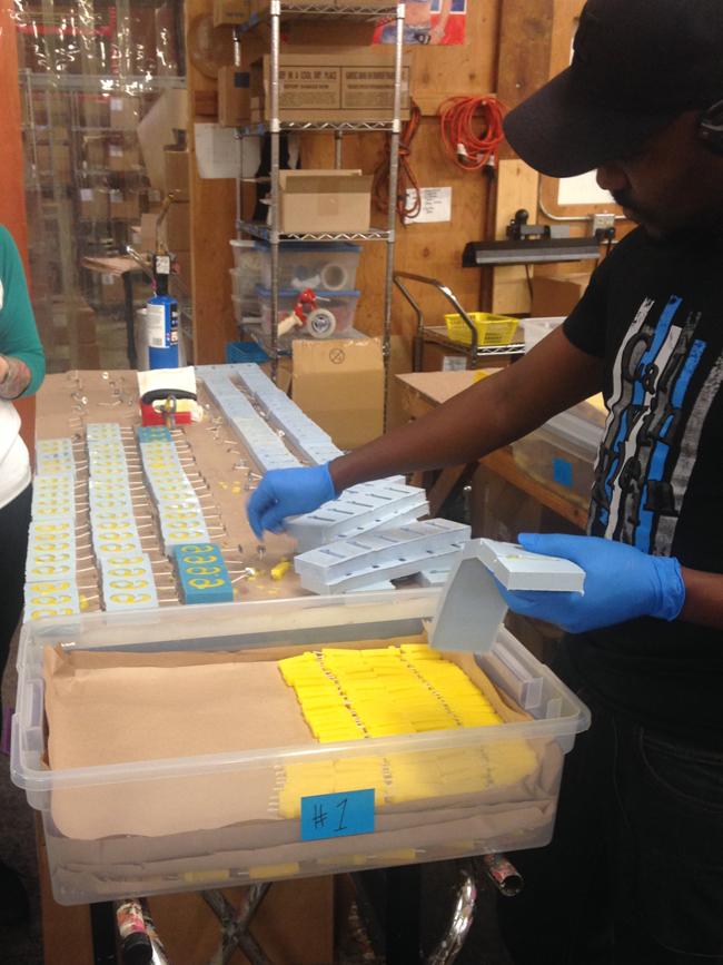 To make number candles, wicks are placed in the molds, hot wax is poured in, and the cooled candles are popped out, all by hand.