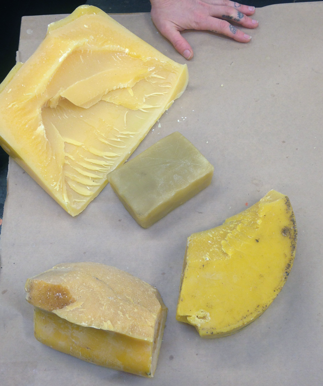 Flower passed around four big hunks of beeswax. I was surprised that each had its own unique fragrance—one offered notes of cinnamon and spice, and another was distinctly floral, like clover. Holding up the small block pictured below, Flower explained that it was about a pound of beeswax: A season’s hard work for an entire hive, maybe 40,000 to 60,000 bees, along with about 70 pounds of honey.