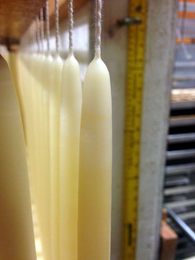 Right: After candles are removed from their molds, the bottoms are smoothed by hand on a warm surface.