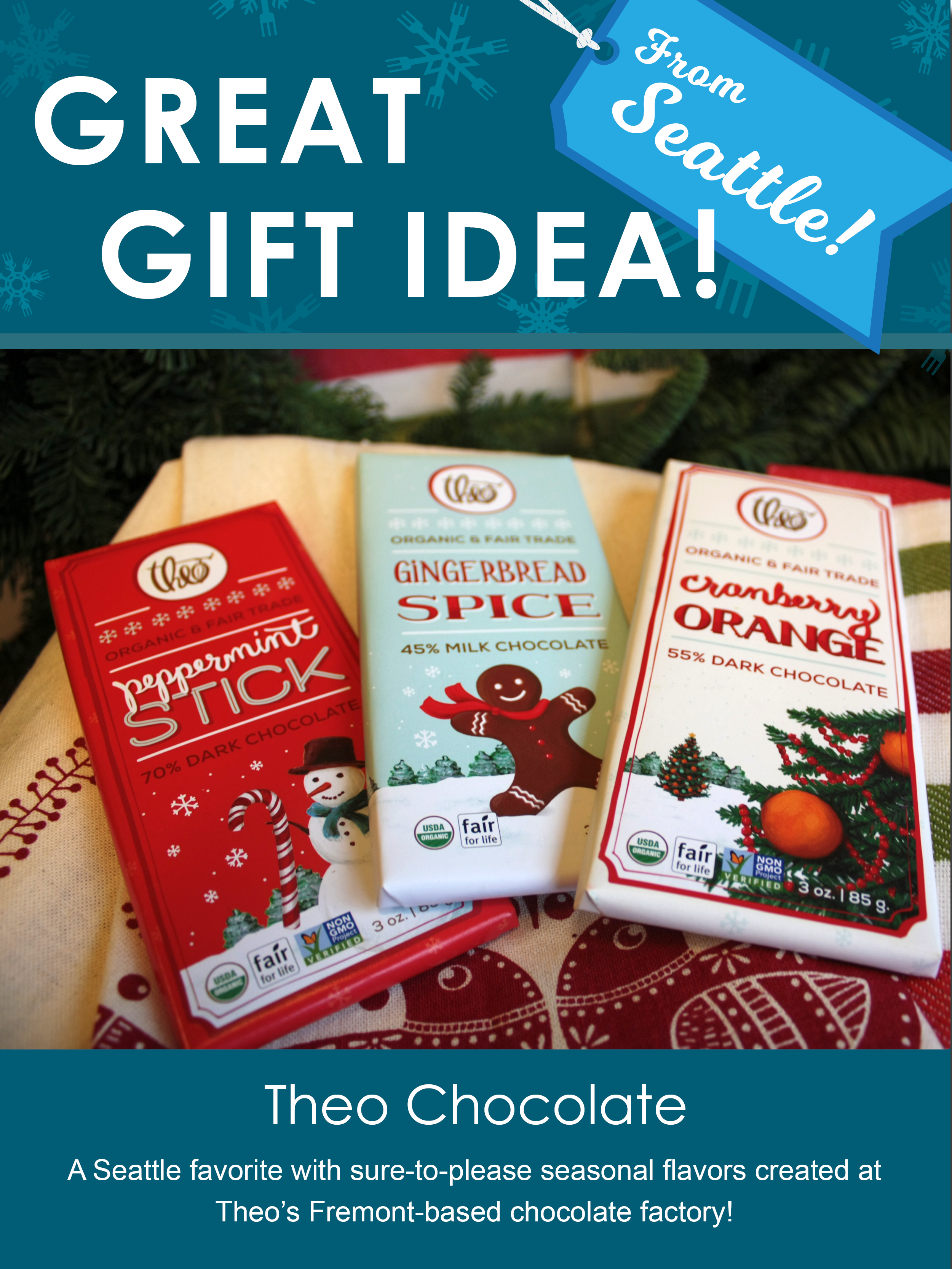 We now have Theo’s seasonal flavors: Gingerbread Spice, Cranberry Orange, Nutcracker Brittle, Peppermint Stick, and that they’re flying off the shelves. So help Santa create some smiles by giving the gift of Theo Chocolate! (And when you do, get another couple for yourself. You won’t regret it.) |